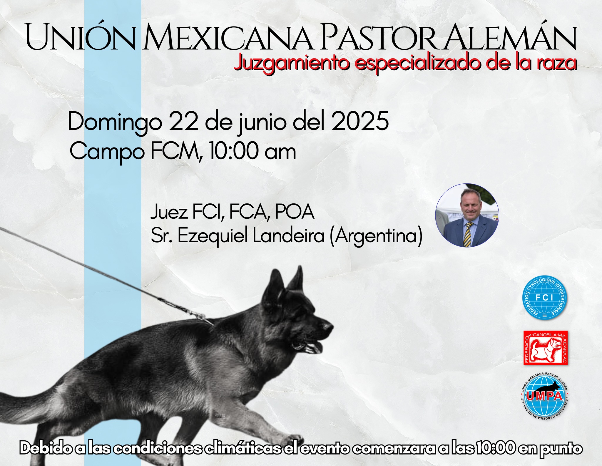 La Unión Mexicana Pastor  Alemán invita a la exposición Especializada de la raza Pastor Alemán, que será este domingo 22 de junio, en el Campo de la FCM, Ciudad de México.